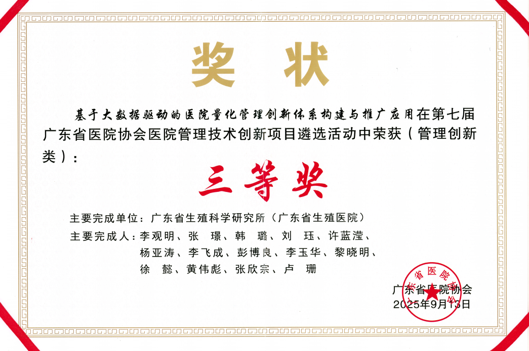 扎实开展深入贯彻中央八项规定精神学习教育。顺利完成党委委员增补、党支部设置优化调整及换届选举,开展党员亮身份当先锋活动,提升基层党组织的“战斗力”。2025年,广东省生殖科学研究所(广东省生殖医院)荣获“全国卫生健康系统先进集体”称号;生殖医学中心党支部获评省直机关“四强”党支部。生殖医学中心党支部“致力推动低本惠民助孕工程——氯米芬(CC)方案的创新实践”项目,在全省5000多个项目中脱颖而出,荣获第十三届广东省“先锋杯”工作创新赛服务增效类三等奖。